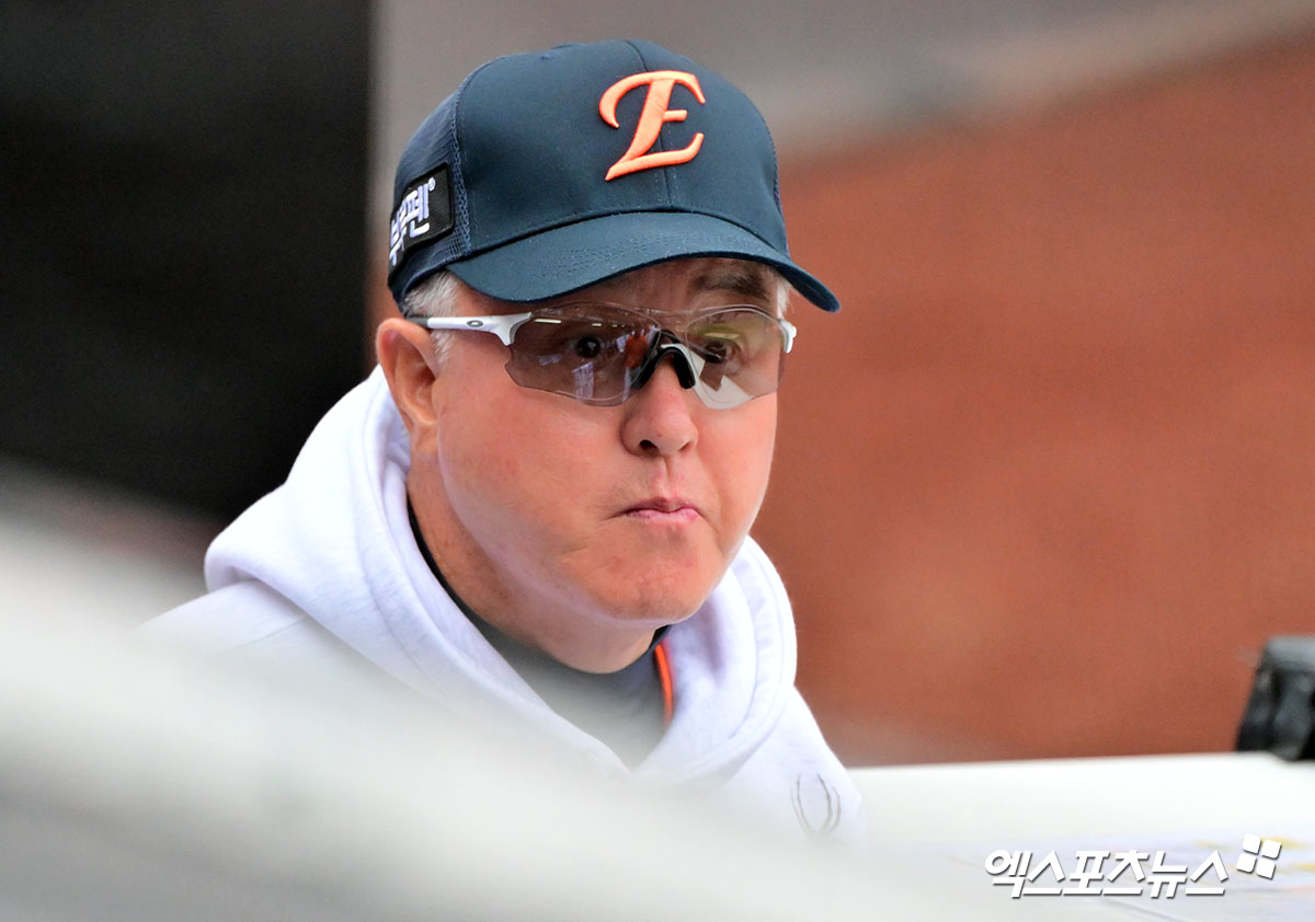 (엑스포츠뉴스 대전, 김한준 기자) 18일 오후 대전 한화생명 볼파크에서 열린 '2025 신한 SOL Bank KBO 포스트시즌' 삼성 라이온즈와 한화 이글스의 플레이오프 1차전 경기, 한화 김경문 감독이 더그아웃을 바라보고 있다.