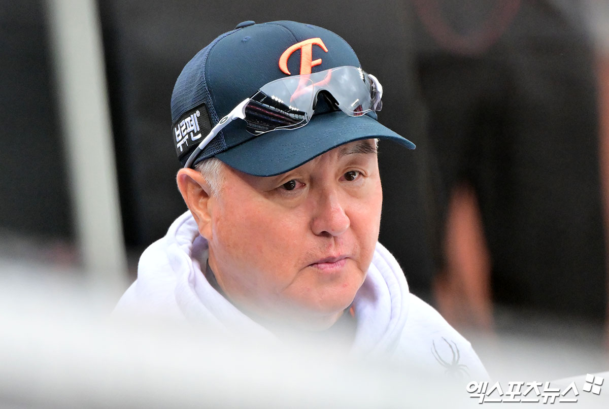 (엑스포츠뉴스 대전, 김한준 기자) 18일 오후 대전 한화생명 볼파크에서 열린 '2025 신한 SOL Bank KBO 포스트시즌' 삼성 라이온즈와 한화 이글스의 플레이오프 1차전 경기, 한화 김경문 감독이 더그아웃을 바라보고 있다.