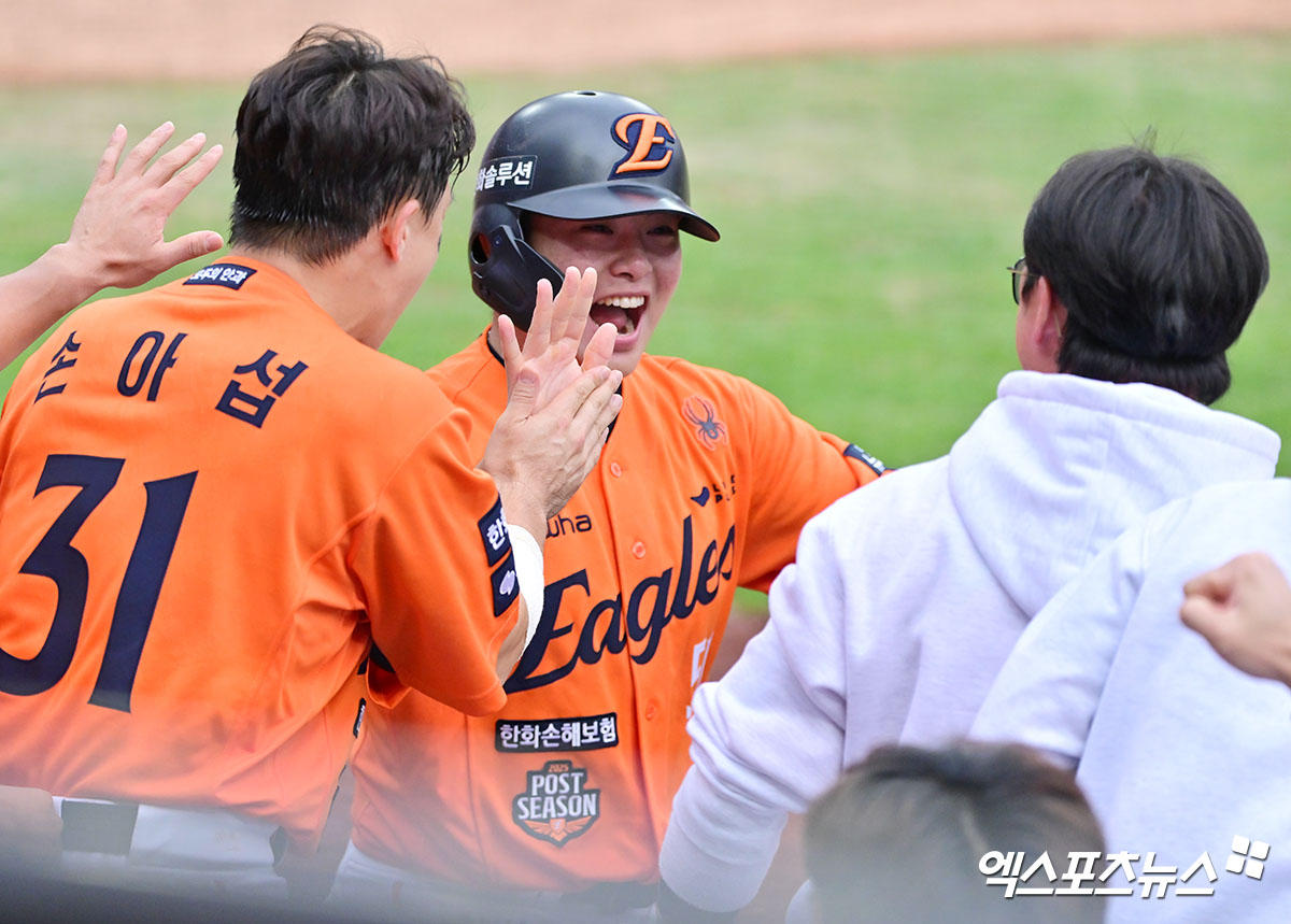(엑스포츠뉴스 대전, 김한준 기자) 18일 오후 대전 한화생명 볼파크에서 열린 '2025 신한 SOL Bank KBO 포스트시즌' 삼성 라이온즈와 한화 이글스의 플레이오프 1차전 경기, 2회말 2사 3루 한화 문현빈이 노시환의 1타점 적시타때 득점에 성공하고 있다.
