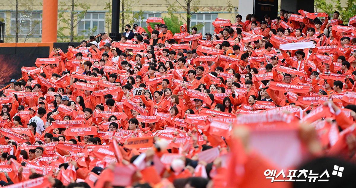 (엑스포츠뉴스 대전, 김한준 기자) 18일 오후 대전 한화생명 볼파크에서 열린 '2025 신한 SOL Bank KBO 포스트시즌' 삼성 라이온즈와 한화 이글스의 플레이오프 1차전 경기, 한화 팬들이 열정적인 응원을 펼치고 있다.