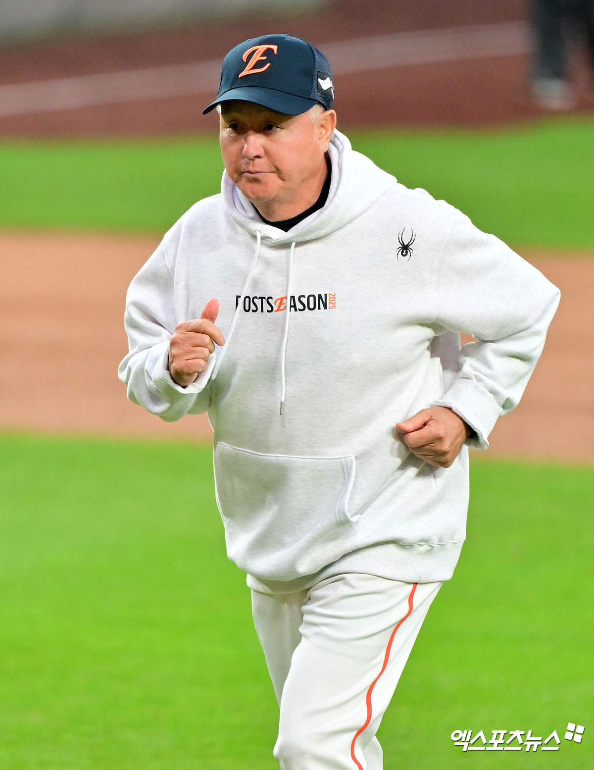 (엑스포츠뉴스 대전, 김한준 기자) 18일 오후 대전 한화생명 볼파크에서 열린 '2025 신한 SOL Bank KBO 포스트시즌' 삼성 라이온즈와 한화 이글스의 플레이오프 1차전 경기, 9회초 한화 김경문 감독이 마운드를 방문해 선수들을 격려하고 있다.