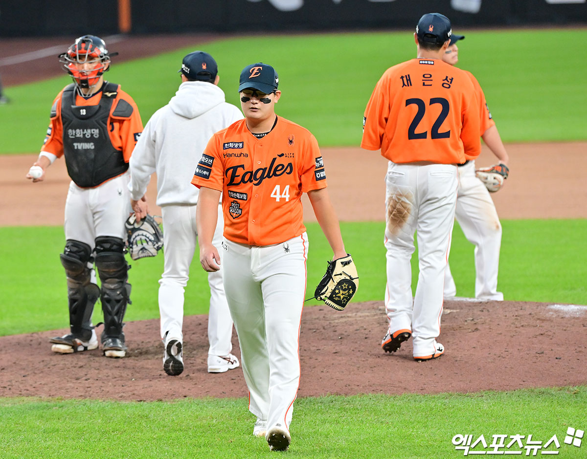 (엑스포츠뉴스 대전, 김한준 기자) 18일 오후 대전 한화생명 볼파크에서 열린 '2025 신한 SOL Bank KBO 포스트시즌' 삼성 라이온즈와 한화 이글스의 플레이오프 1차전 경기, 9회초 1사 1루 한화 김서현이 마운드를 내려오고 있다.