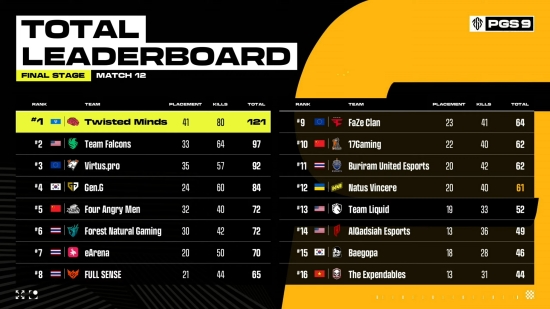 파이널 2일 차 경기 결과, 트위스티드 마인즈가 121점으로 1위 자리를 지켰다. 이들은 2일 차 기준 유일한 세자릿수 포인트 팀으로, 97점인 2위 팀 팔콘스와 20점 이상 격차를 벌렸다.