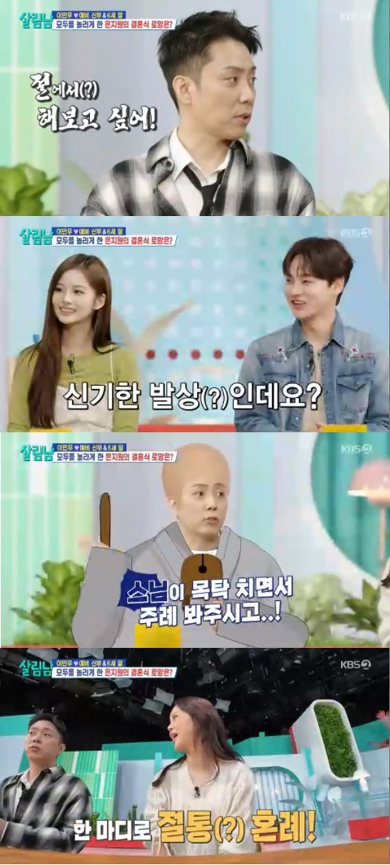 은지원은 "스님이 목탁 치면서 주례 봐주시고 절통혼례 이런 거 없나"라고 거듭 절 혼례에 대한 로망을 드러냈다.