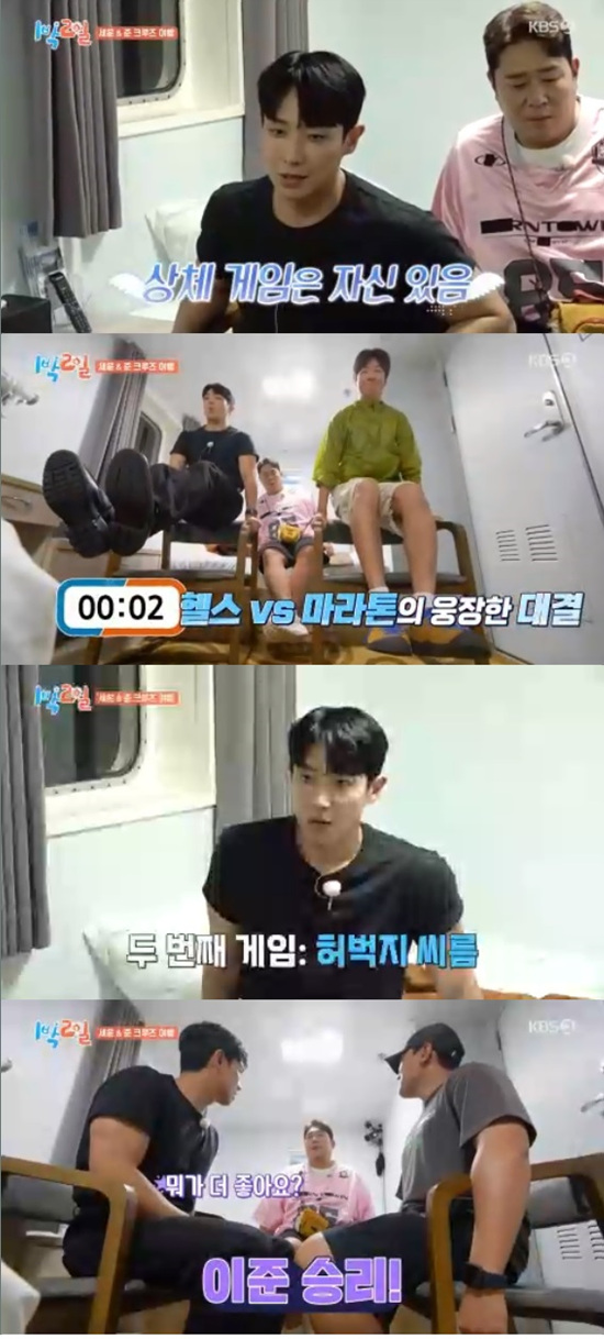 두 번째 대결은 이준과 준우 피디의 허벅지 씨름으로 진행됐다. 이준은 "체급이 다르다. 하체 봐라. 어떻게 이기냐. 전 만들어진 몸이고 여기는 리얼이다"라고 난감해 했다.