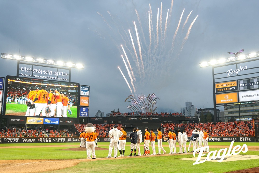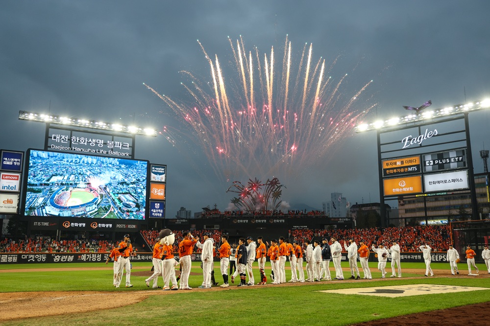 올해 홈 100만 관중 돌파, 정규시즌 마지막 경기 뒤 출정식 등에서 한화의 장기인 불꽃놀이가 이뤄졌으나 진 경기 뒤엔 조용히 조명탑이 꺼지기 마련이다.