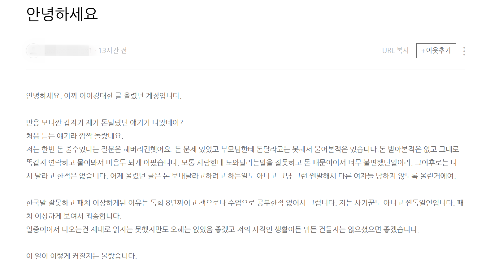 이에 네티즌들은 "독일인이 네이버 블로그를 한다고?", "말하는 걸 보니 누가 봐도 외국인이 아니다", "고소한다니까 부랴부랴 우리나라 사람이 외국인인 척 어설프게 연기하는 느낌", "한국어 잘 못하는데 한국말 패치 이런 말을 쓰나?", "외국인 치고 대화가 너무 한국인의 그것이다"는 반응을 보였다.