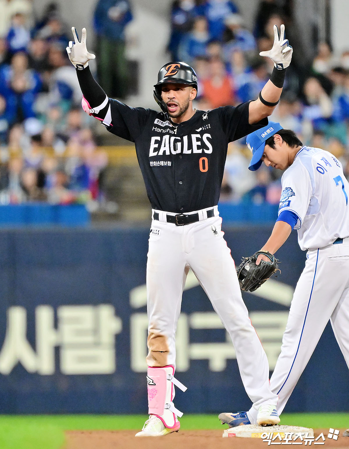 (엑스포츠뉴스 대구, 김한준 기자) 21일 오후 대구삼성라이온즈파크에서 열린 '2025 신한 SOL Bank KBO 포스트시즌' 한화 이글스와 삼성 라이온즈의 플레이오프 3차전 경기, 5회초 1사 2루 한화 리베라토가 1타점 2루타를 날리고 있다.