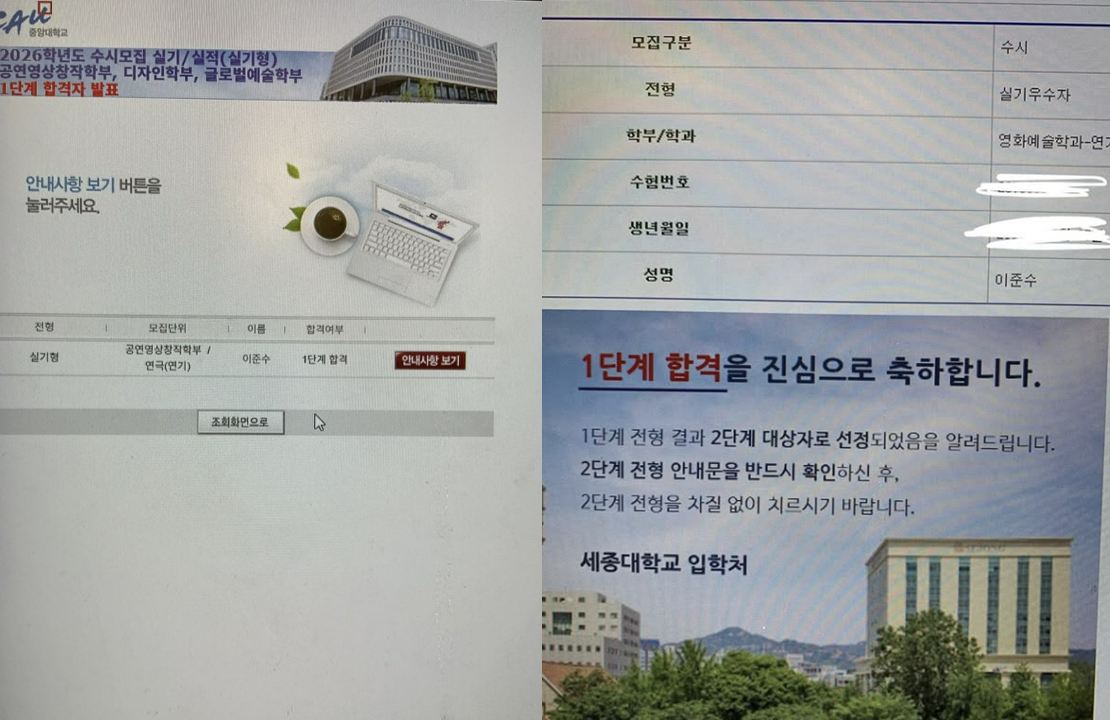 학원이 공개한 바에 따르면 이준수는 중앙대학교 공연영상창작학부 연극(연기)전공, 세종대학교 영화예술학과 연기예술전공에 1차 합격했다.