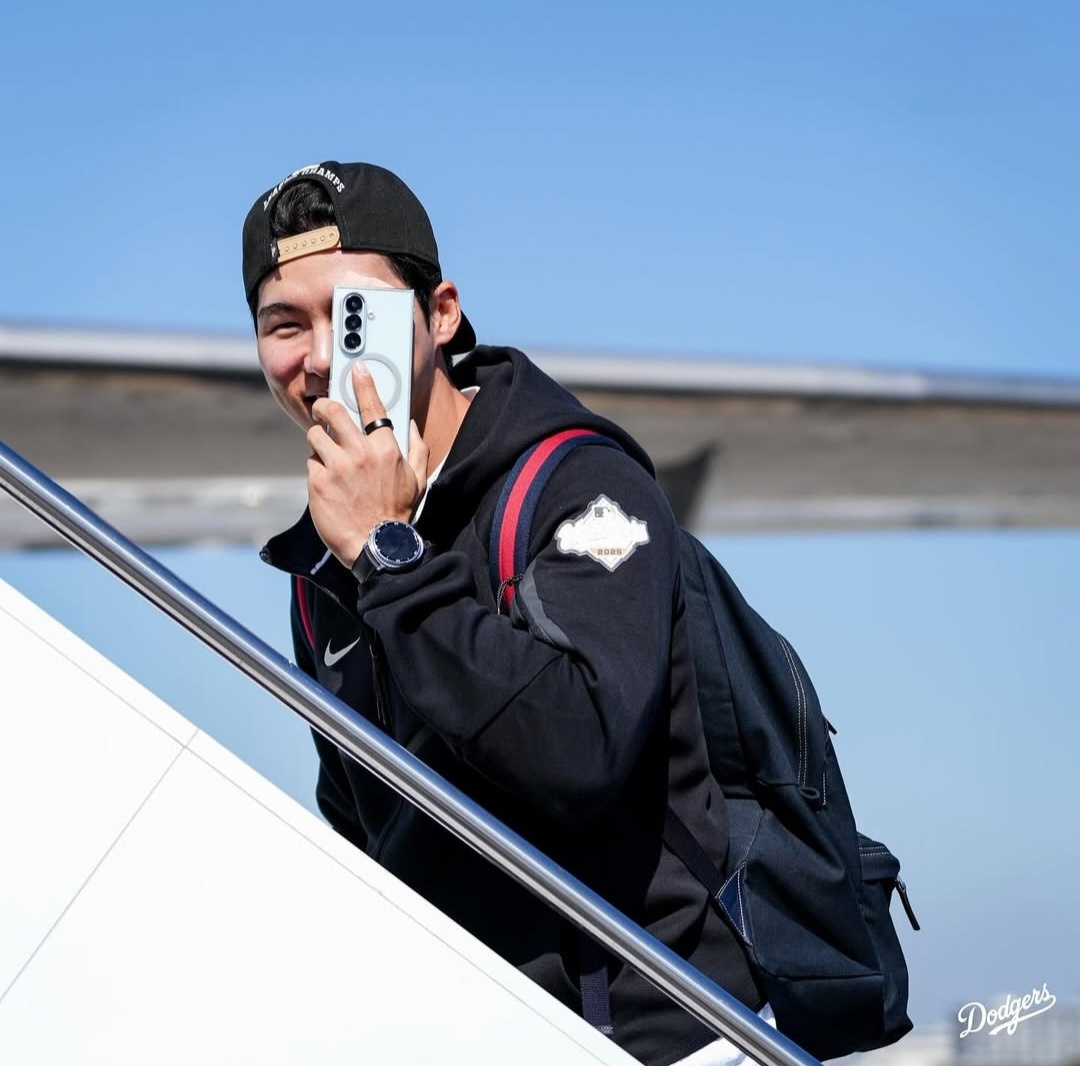 다저스는 오타니 쇼헤이를 비롯해 야마모토 요시노부, 클레이튼 커쇼, 무키 베츠 등 슈퍼 스타들이 비행기에 오른 가운데 김혜성의 얼굴도 보였다. 김혜성은 스마트폰으로 자신의 얼굴을 살짝 가리는 장난을 치면서 활짝 웃는 표정으로 비행기에 올랐다.