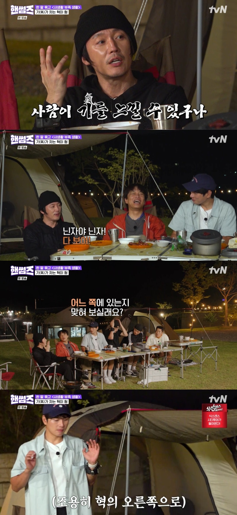 장혁은 "진짜 웃긴 건 사람의 기를 느낄 수 있다. 기척이 느껴진다. 닌자다 닌자. 다 보인다"라고 자신했다. 이에 이이경은 "제가 뒤에 서 있으면 어느 쪽에 있는지 맞혀라"라고 제안했다.