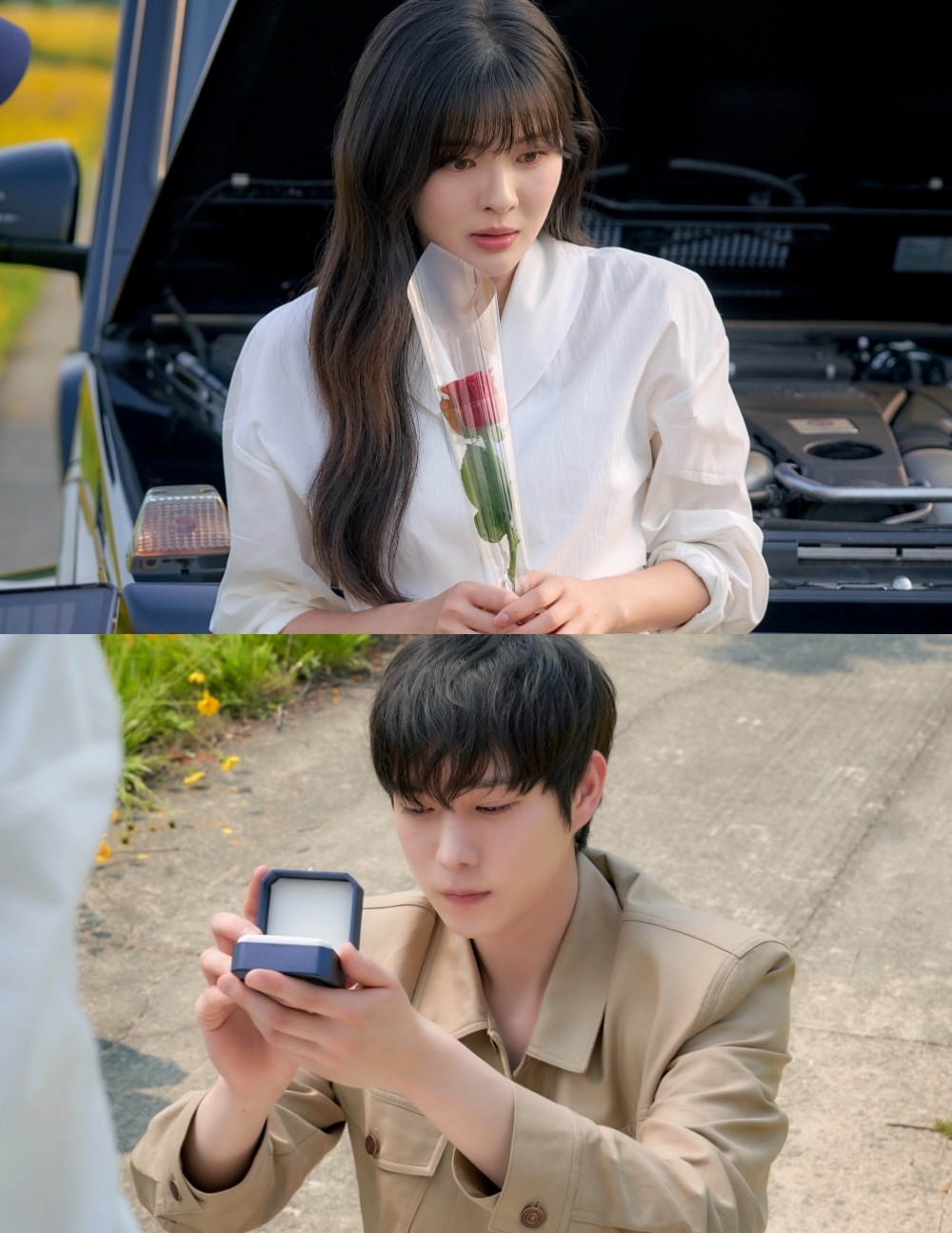 이런 가운데 10월 24일 '달까지 가자' 제작진이 다해와 함박사의 프러포즈 장면이 포착된 스틸을 공개해 시선을 사로잡는다. 사진 속 함박사는 붉은 장미 한 송이와 반지를 내밀고 있다. 노란 꽃이 만개한 배경 속에 두 사람을 비추는 햇살이 로맨틱함을 더한다. 그러나 무슨 이유에선지 함박사를 바라보는 다해의 얼굴에는 설렘보다 복잡한 감정이 서려 있어 호기심을 자아낸다. 함박사의 프러포즈에 다해는 어떤 선택을 내리게 될까.