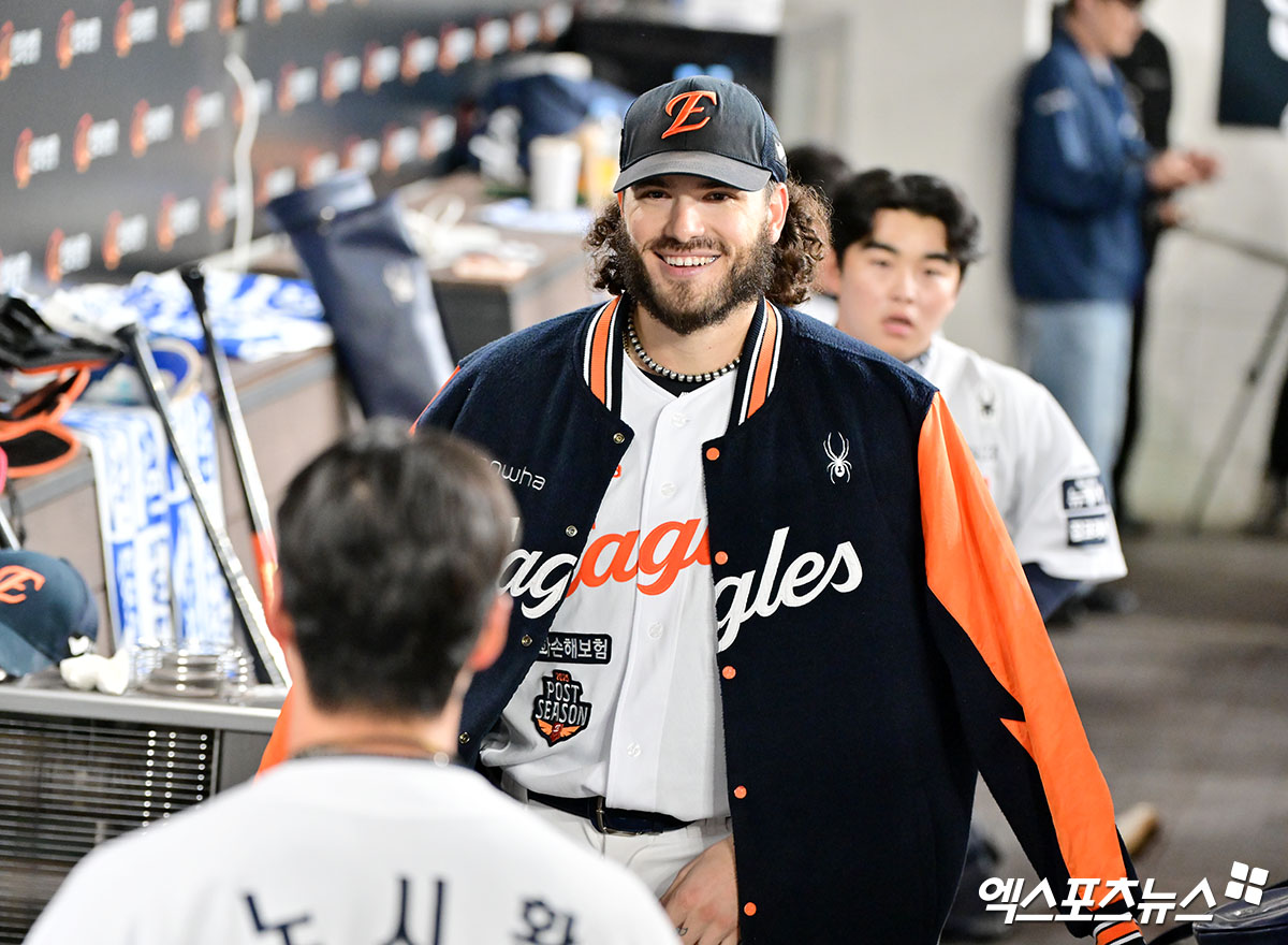 (엑스포츠뉴스 대전, 김한준 기자) 24일 오후 대전 한화생명 볼파크에서 열린 '2025 신한 SOL Bank KBO 포스트시즌' 삼성 라이온즈와 한화 이글스의 플레이오프 5차전 경기, 3회말 1사 1,3루 한화 폰세가 채은성의 1타점 2루타때 득점에 성공한 노시환을 보며 미소를 보이고 있다.