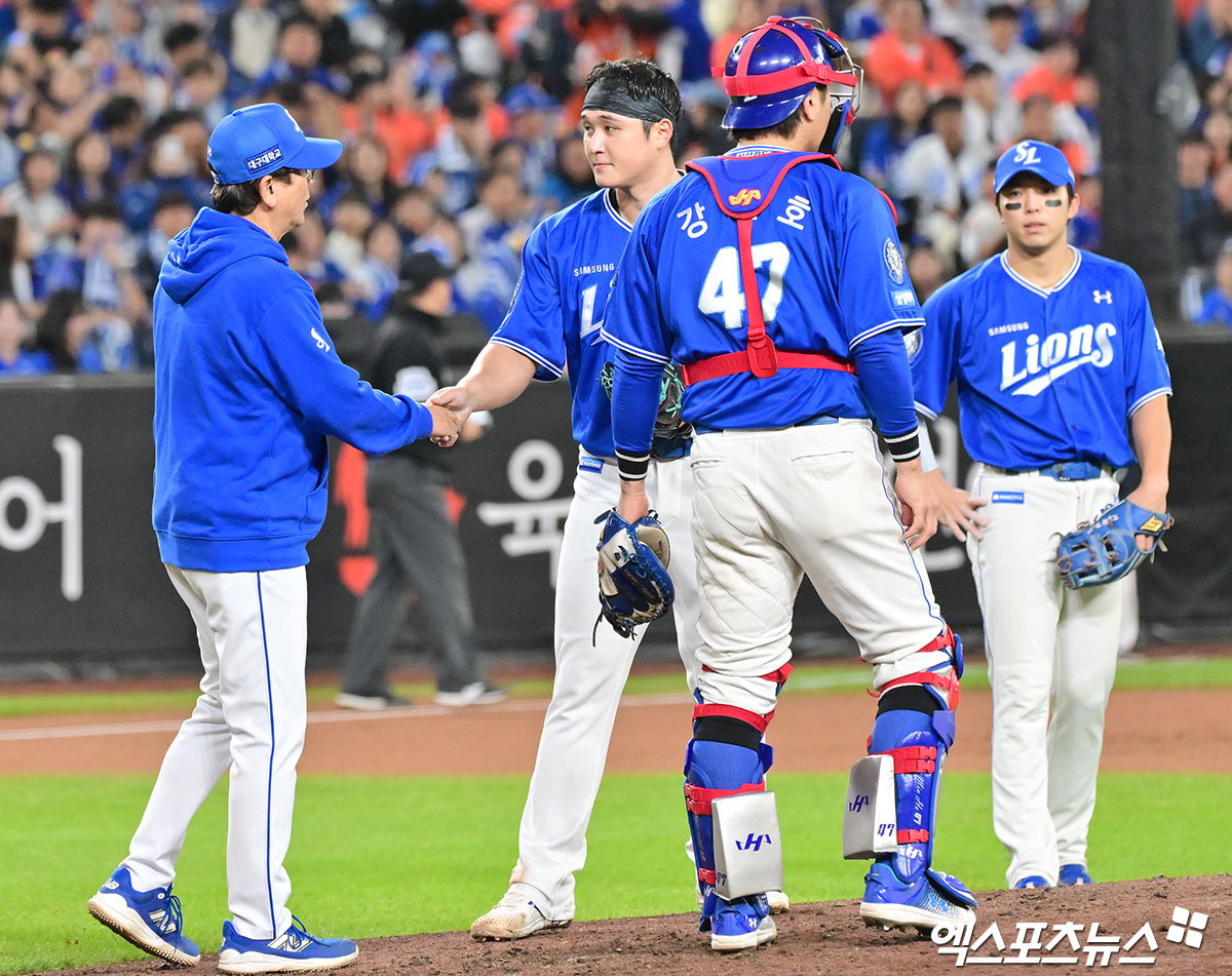 (엑스포츠뉴스 대전, 김한준 기자) 24일 오후 대전 한화생명 볼파크에서 열린 '2025 신한 SOL Bank KBO 포스트시즌' 삼성 라이온즈와 한화 이글스의 플레이오프 5차전 경기, 4회말 1사 삼성 최원태가 마운드를 내려오고 있다.