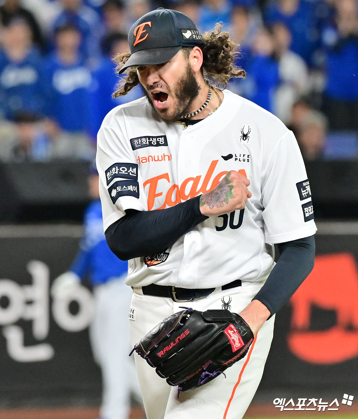 또 "문동주가 플레이오프 3차전에서 50개가 넘는 공을 던졌다"며 "외국인 투수 두 명이 우리 팀 원투펀치다. (두 사람 모두) 4일 이상 쉬고나간다. 폰세가 몇회까지 던질지는 모르겠지만, 일단 5회까지 던진다고 생각하고 그 다음에 와이스까지 (투수를) 2명으로 끝내려고 한다"고 설명했다.