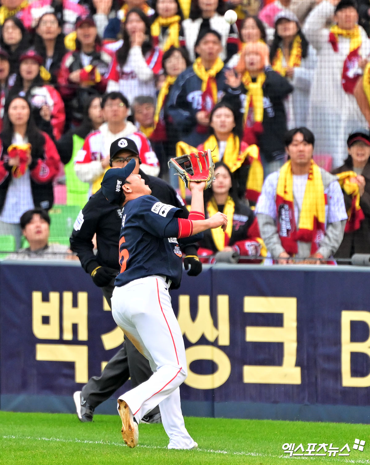 (엑스포츠뉴스 잠실, 김한준 기자) 26일 오후 서울 송파구 잠실야구장에서 열린 '2025 신한 SOL Bank KBO 한국시리즈' 한화 이글스와 LG 트윈스의 1차전 경기, 2회말 한화 하주석이 LG 박동원의 파울 타구를 잡고 있다.