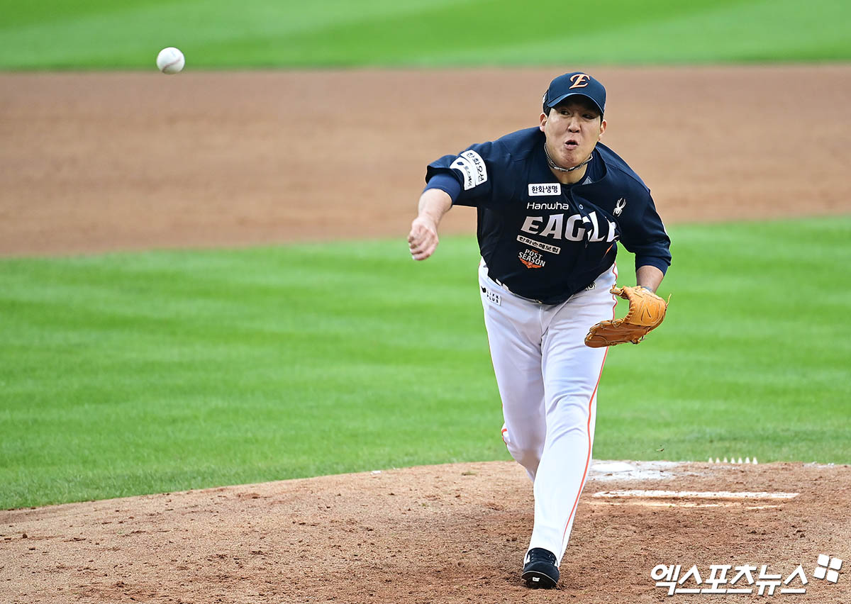 (엑스포츠뉴스 잠실, 박지영 기자) 26일 오후 서울 송파구 잠실야구장에서 열린 '2025 신한 SOL Bank KBO 한국시리즈' 한화 이글스와 LG 트윈스의 1차전 경기, 6회말 1사 만루 한화 박상원이 역투하고 있다.