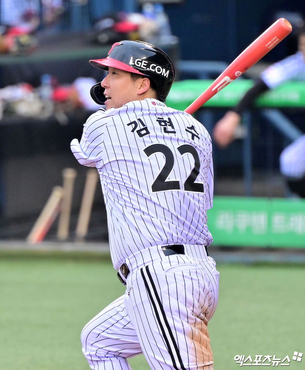 (엑스포츠뉴스 잠실, 김한준 기자) 26일 오후 서울 송파구 잠실야구장에서 열린 '2025 신한 SOL Bank KBO 한국시리즈' 한화 이글스와 LG 트윈스의 1차전 경기, 6회말 2사 1,2루 LG 김현수가 1타점 적시타를 날리고 있다.