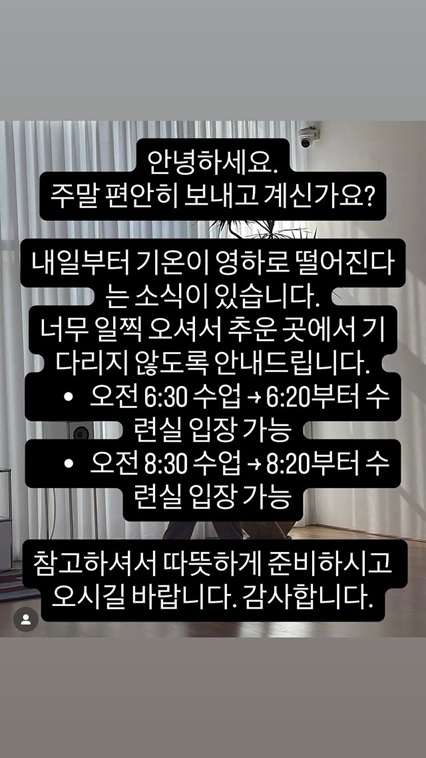 수업 시작 10분 전부터 수련실에 입장할 수 있다고 알린 그는 "따뜻하게 준비하시고 오시길 바란다"고 덧붙이며 수강생들을 챙기는 따스한 마음을 드러냈다.