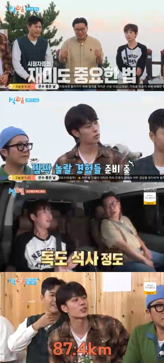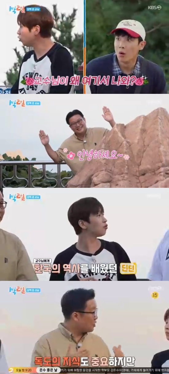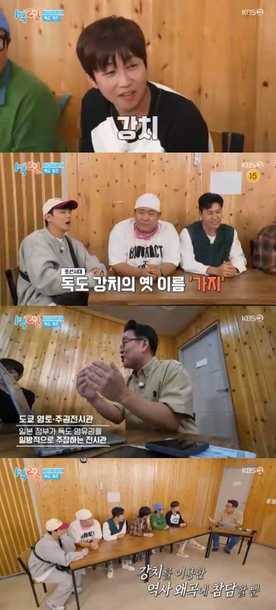 26일 방송된 KBS 2TV '1박 2일 시즌4'에서는 김종민, 문세윤, 조세호, 이준, 딘딘, 유선호가 서경덕 교수와 함께 독도일지를 써 나가는 모습이 전파를 탔다.