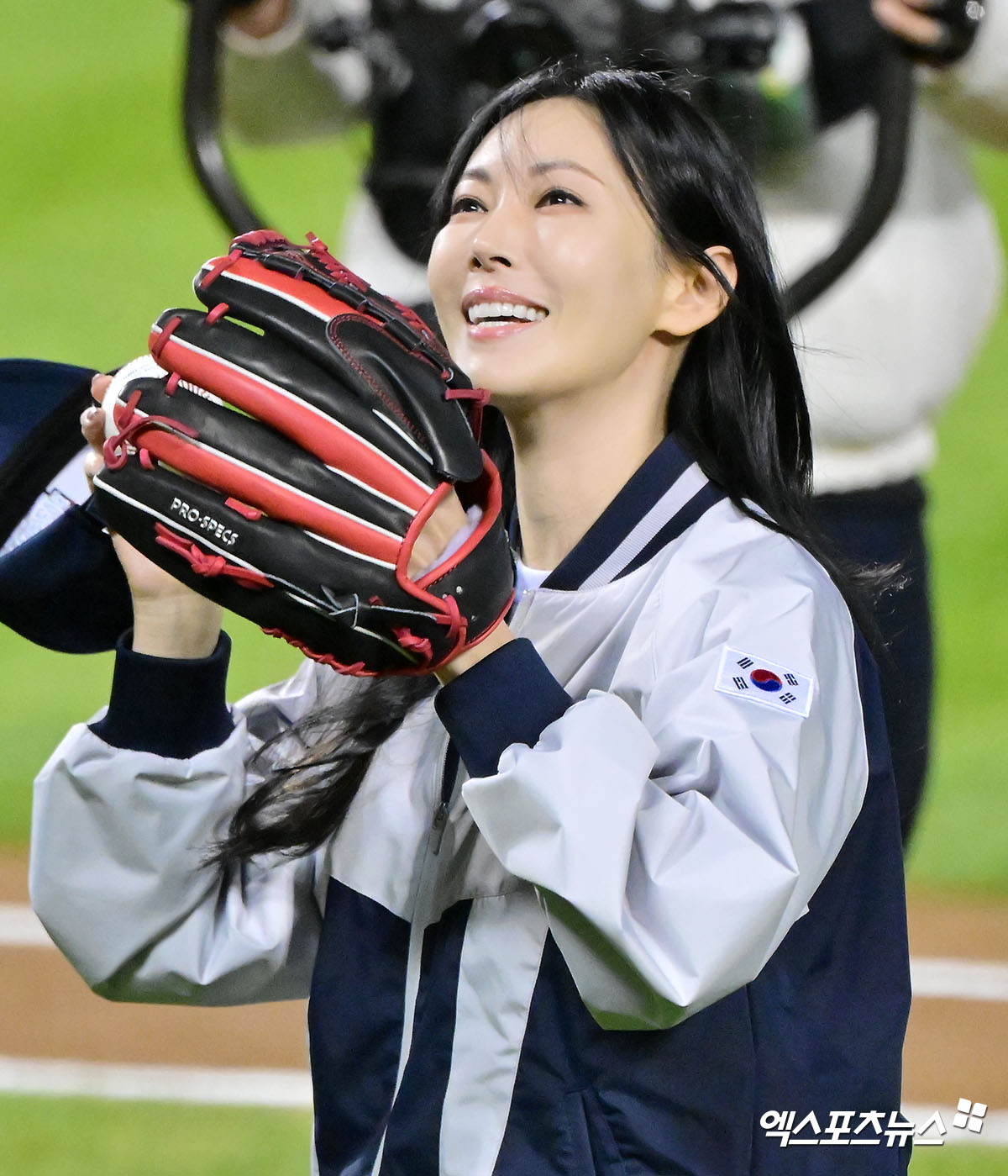 (엑스포츠뉴스 잠실, 김한준 기자) 27일 오후 서울 송파구 잠실야구장에서 열린 '2025 신한 SOL Bank KBO 한국시리즈' 한화 이글스와 LG 트윈스의 2차전 경기, 경기 전 배우 김소연이 시구에 임하고 있다.