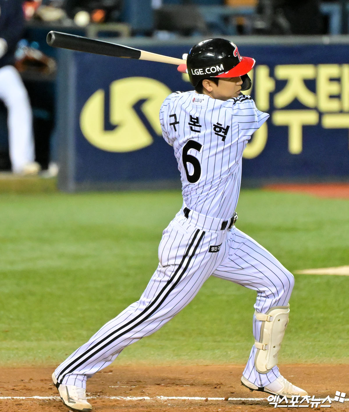 (엑스포츠뉴스 잠실, 김한준 기자) 27일 오후 서울 송파구 잠실야구장에서 열린 '2025 신한 SOL Bank KBO 한국시리즈' 한화 이글스와 LG 트윈스의 2차전 경기, 2회말 무사 2,3루 LG 구본혁이 2타점 적시타를 날리고 있다.