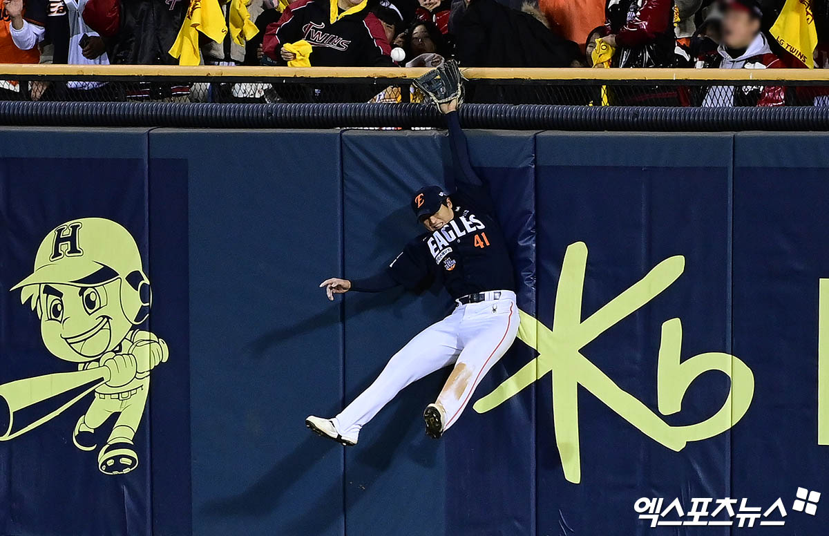 (엑스포츠뉴스 잠실, 박지영 기자) 27일 오후 서울 송파구 잠실야구장에서 열린 '2025 신한 SOL Bank KBO 한국시리즈' 한화 이글스와 LG 트윈스의 2차전 경기, 4회말 2사 만루 LG 문보경의 3타점 적시 2루타 때 한화 우익수 최인호가 점프 캐치를 시도했으나 타구를 잡지 못하고 있다. 이후 LG측 요청으로 비디오 판독 실시했으나 원심 유지되며 2루타.