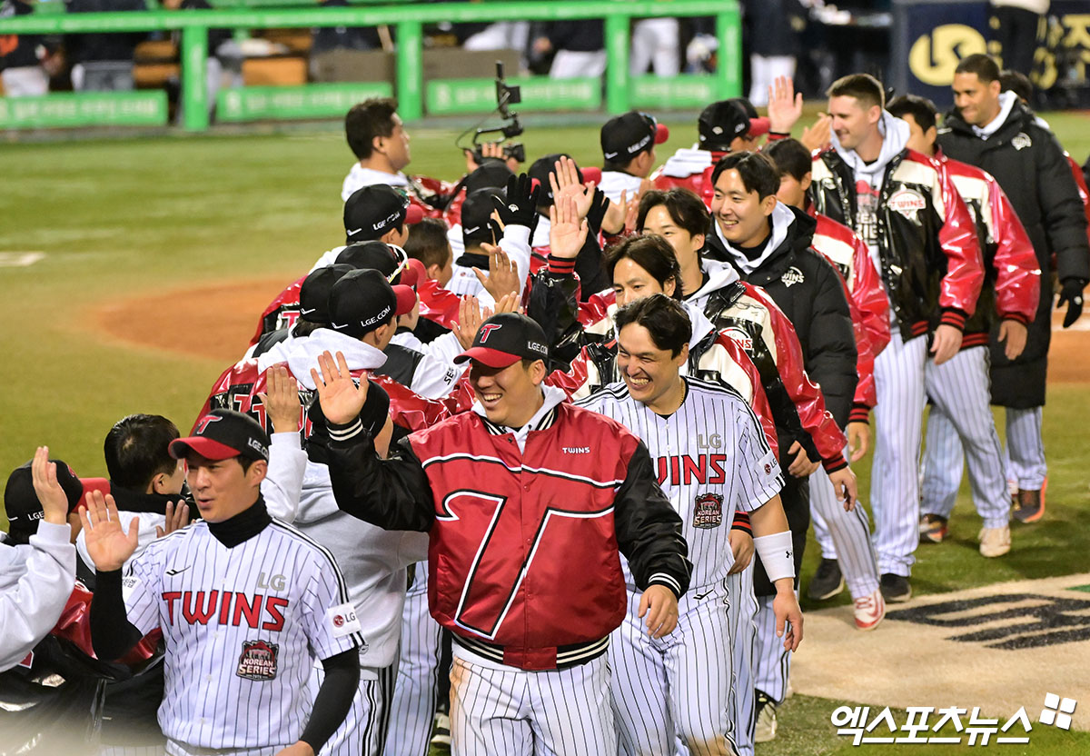이날 경기에서 승리한 LG 선수들이 기뻐하고 있다.