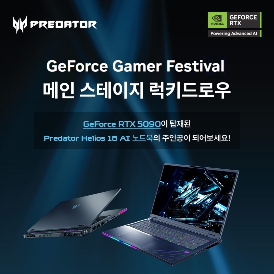 참가자는 '지포스 게이머 페스티벌' 공식 홈페이지를 통해 사전 등록 후 입장할 수 있으며, 사전 등록자에게는 지포스 RTX™ 5090 노트북 GPU가 탑재된 '프레데터 헬리오스 18 AI' 노트북 경품 이벤트 응모 자격이 자동 부여된다.