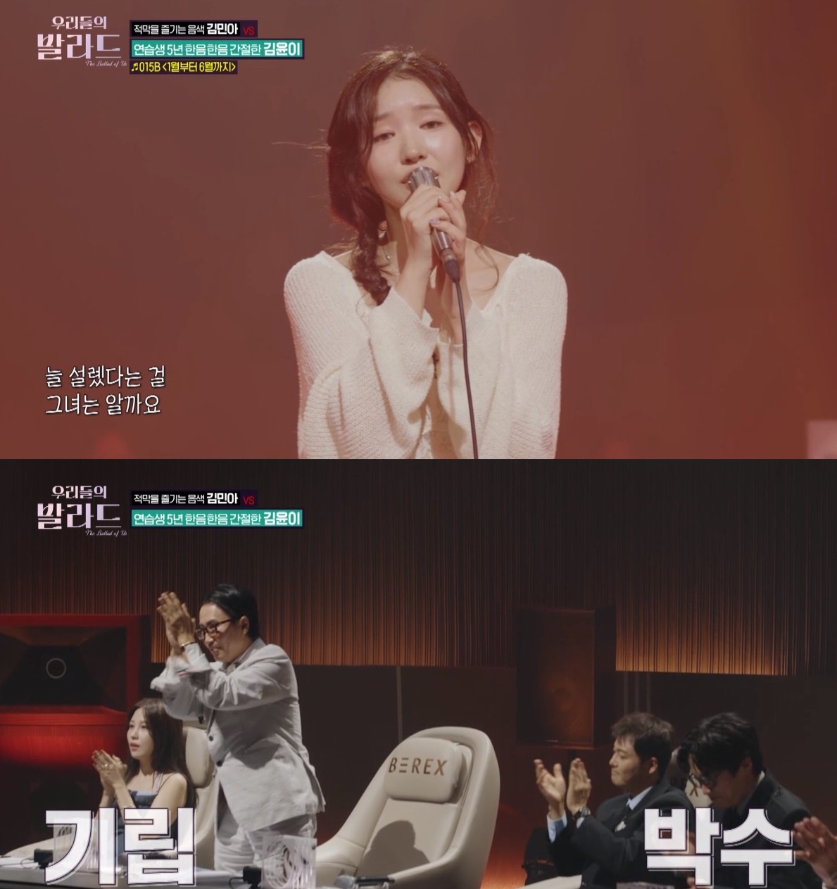 015B(공일오비) ‘1월부터 6월까지’를 통해 감정을 터트린 무대를 선보인 김윤이는 정재형의 기립박수를 받았다. 정재형은 “뭉클했다”며 주눅 들어있던 지난 라운드와 달라진 김윤이의 모습을 짚었다. “갑자기 노래 중간에 자신감도 붙고 ‘내 노래를 표현하겠다’는 의지가 보였던 것 같다. 무엇인가 알을 깨고 나온 것 같은 느낌”이라고 찬사를 보냈다. 서로 다른 매력을 가진 두 사람의 대결은 92표를 받은 김윤이의 승리로 돌아갔다.