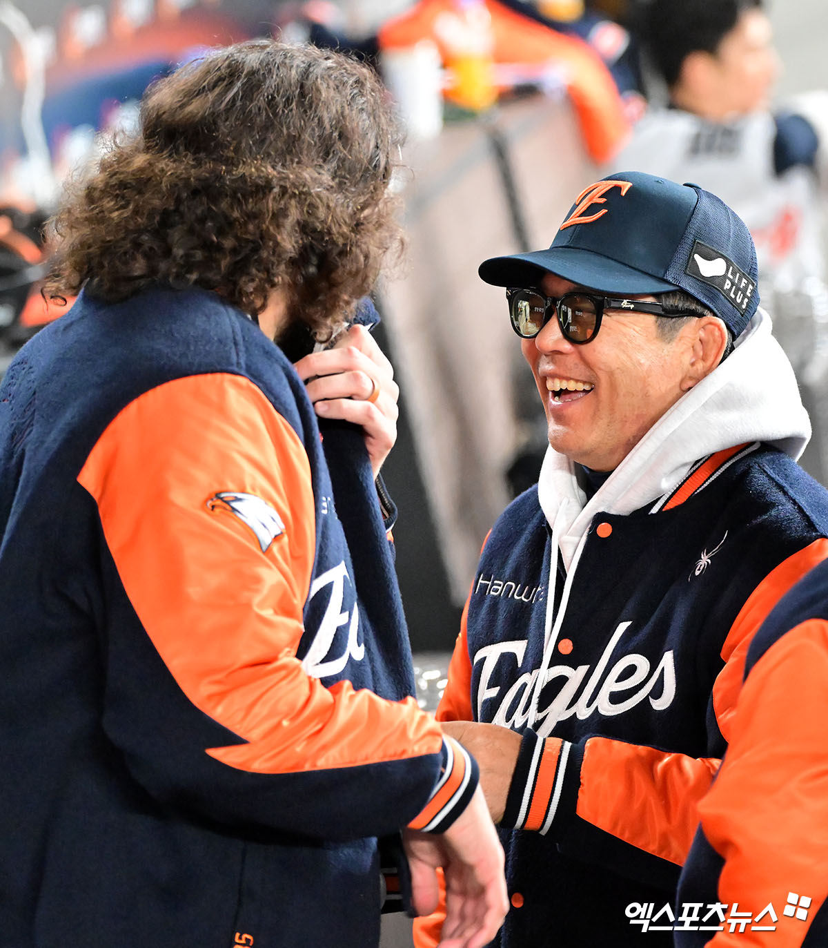 (엑스포츠뉴스 대전, 김한준 기자) 29일 오후 대전 한화생명 볼파크에서 열린 '2025 신한 SOL Bank KBO 한국시리즈' LG 트윈스와 한화 이글스의 3차전 경기, 2회초 수비를 마친 한화 폰세가 양상문 투수코치와 대화를 나누고 있다.