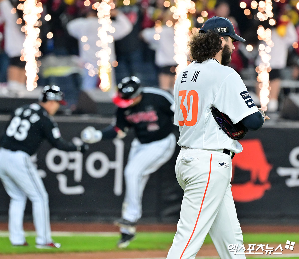 멈춰있던 스코어는 8회초에 움직였다. 한승혁이 박해민을 좌익수 뜬공으로 잡고 홍창기에게 우전 2루타를 맞았고, 바뀐 투수 김범수마저 신민재에게 내야안타를 허용하면서 1사 2, 3루가 됐다. 위기에서 한화의 선택은 김서현. 그러나 김서현의 폭투로 3루에 있던 대주자 최원영이 홈인했다. 점수는 3-1. 김서현은 오스틴과 김현수를 모두 뜬공으로 잡고 이닝을 끝냈다.