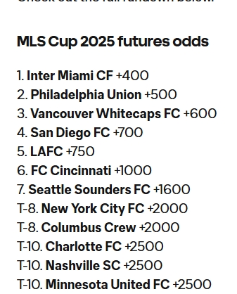 여기에서 손흥민의 소속팀 LAFC는 전체 5위(+750)에 머물렀다. 1위는 리오넬 메시가 소속된 인터 마이애미(+400), 2위는 필라델피아 유니언(+500), 3위는 서부 콘퍼런스 강자이자 독일 레전드 토마스 뮐러가 손흥민과 같은 시기에 이적해 화제를 모은 밴쿠버 화이트캡스(+600), 4위는 서부 콘퍼런스 우승 팀 샌디에이고FC(+700)가 차지했다.