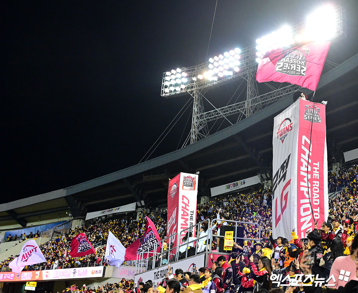 LG 구단 측은 29일 "오후 7시10분 전광판 중계를 보며 응원 중인 잠실야구장 원정 응원 현장(프리미엄석·외야석 제외) 1만 6500석이 매진됐다"고 밝혔다.