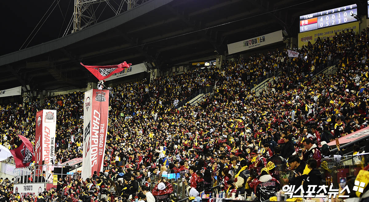 같은 날 대전 한화생명볼파크에서 열린 한국시리즈 3차전에 총 1만 6750명 만원 관중이 들어찼다. 거기에 버금가는 인원이 잠실 원격 응원전에 참석한 셈이다.