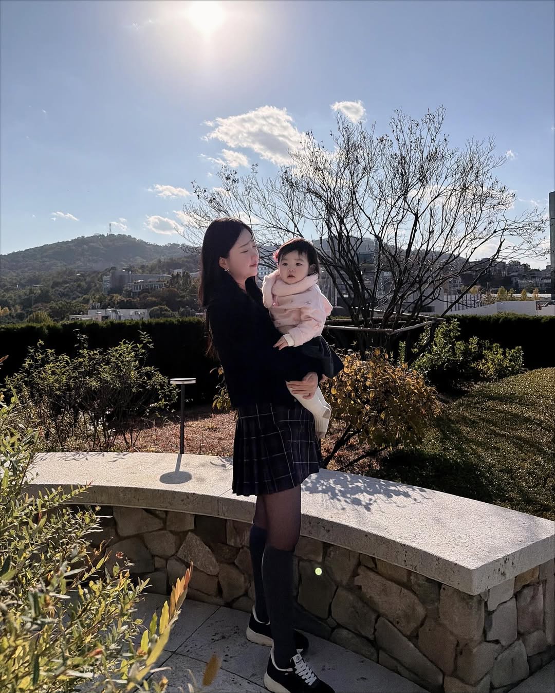 딸 재이는 분홍색 털카라 아우터와 그레이 플리츠 스커트, 아이보리 니삭스로 깜찍한 스타일을 뽐내며 김다예의 패션센스를 짐작케 했다.