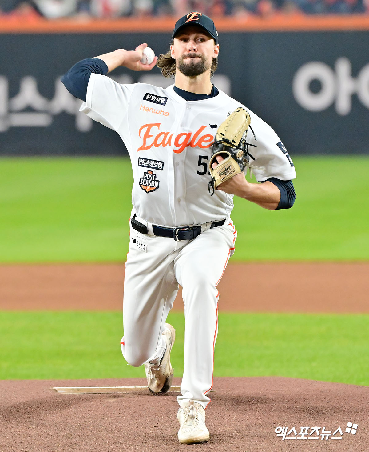 (엑스포츠뉴스 대전, 김한준 기자) 30일 오후 대전 한화생명 볼파크에서 열린 '2025 신한 SOL Bank KBO 한국시리즈' LG 트윈스와 한화 이글스의 4차전 경기, 1회초 한화 선발투수 와이스가 공을 힘차게 던지고 있다.