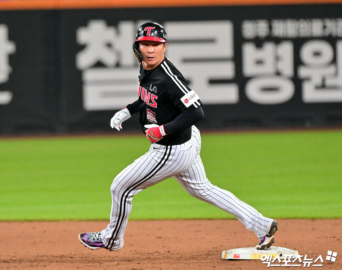(엑스포츠뉴스 대전, 김한준 기자) 30일 오후 대전 한화생명 볼파크에서 열린 '2025 신한 SOL Bank KBO 한국시리즈' LG 트윈스와 한화 이글스의 4차전 경기, 5회초 LG 오지환이 2루타를 날리고 있다.
