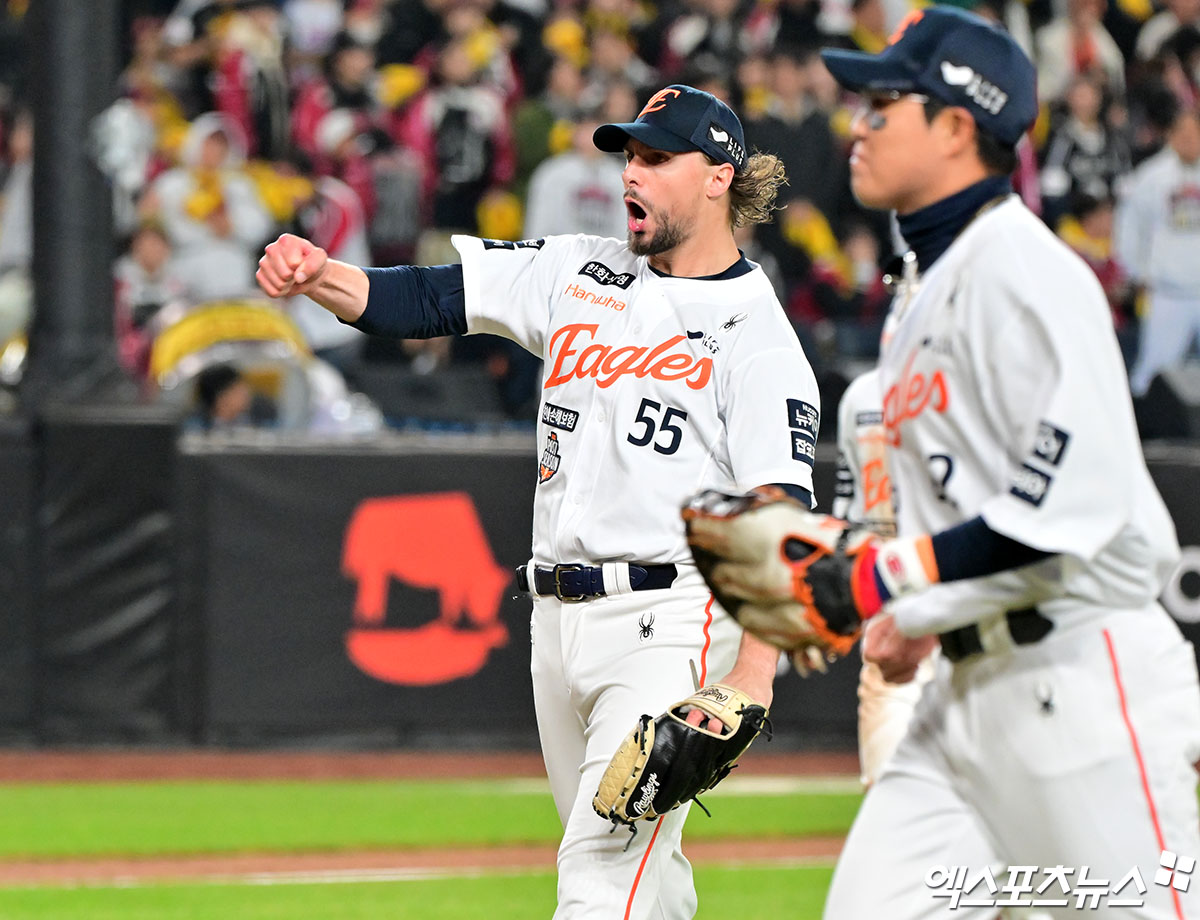 (엑스포츠뉴스 대전, 김한준 기자) 30일 오후 대전 한화생명 볼파크에서 열린 '2025 신한 SOL Bank KBO 한국시리즈' LG 트윈스와 한화 이글스의 4차전 경기, 5회초 1사 1,3루 한화 와이스가 LG 박해민을 병살타로 아웃시킨 후 기뻐하고 있다.