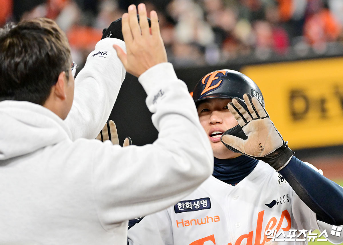 (엑스포츠뉴스 대전, 김한준 기자) 30일 오후 대전 한화생명 볼파크에서 열린 '2025 신한 SOL Bank KBO 한국시리즈' LG 트윈스와 한화 이글스의 4차전 경기, 8회말 2사 2루 한화 이원석이 최재훈의 1타점 적시타때 득점에 성공하고 있다.