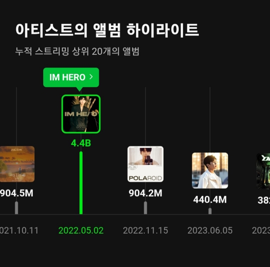 최근 임영웅의 정규 앨범 'IM' HERO'는 멜론 누적 스트리밍 44억 회를 돌파했다.