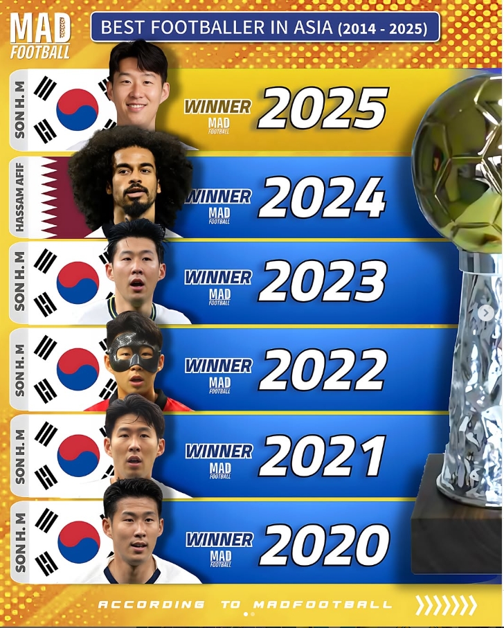 글로벌 축구 콘텐츠 제작소 '매드풋볼'은 31일(한국시간) 공식 채널을 통해 최근 12년 동안 아시아 최고의 축구선수로 선정된 선수들을 공개했다.