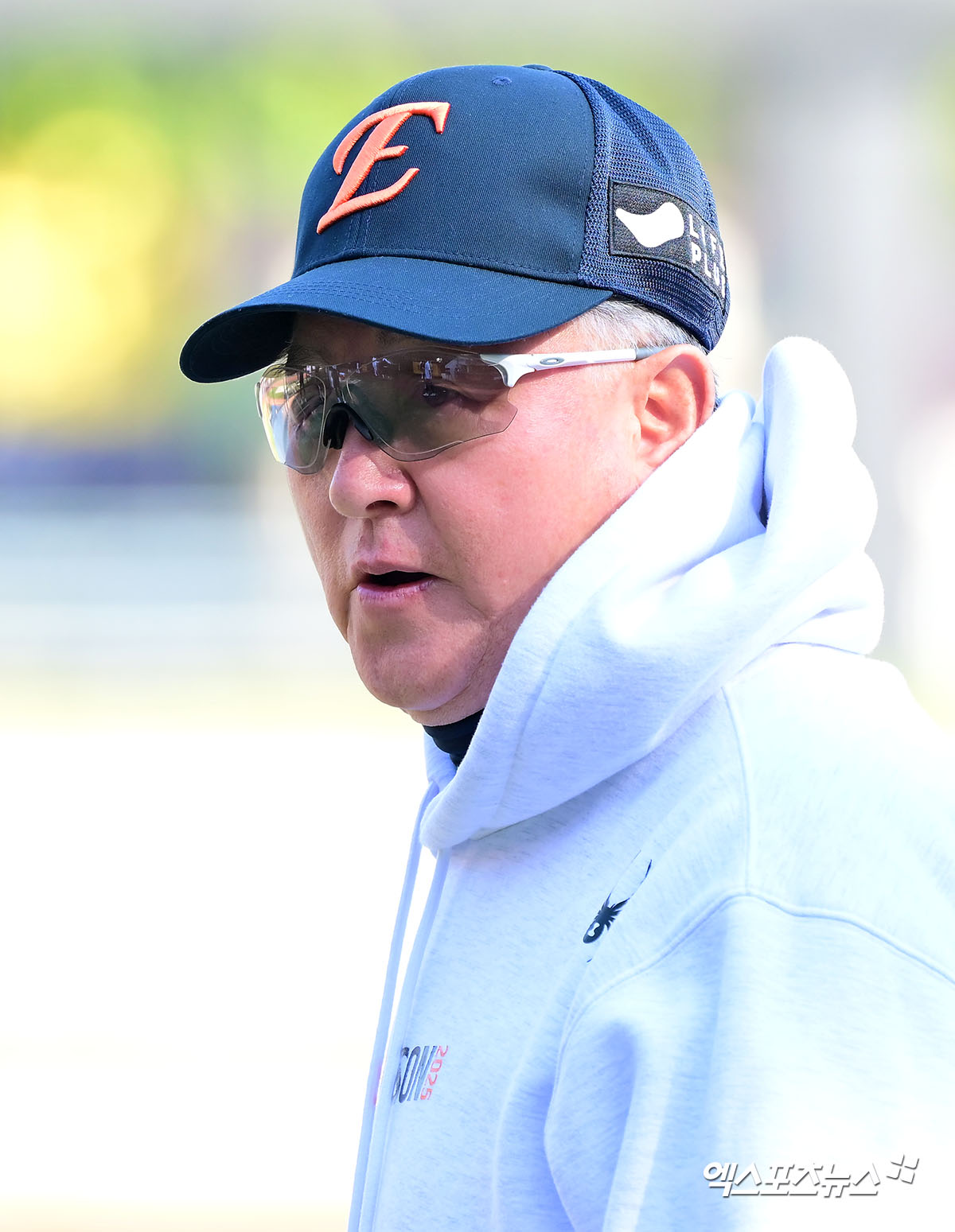 (엑스포츠뉴스 대전, 김한준 기자) 31일 오후 대전 한화생명 볼파크에서 열리는 '2025 신한 SOL Bank KBO 한국시리즈' LG 트윈스와 한화 이글스의 5차전 경기, 한화 김경문 감독이 선수들과 인사를 하고 있다.