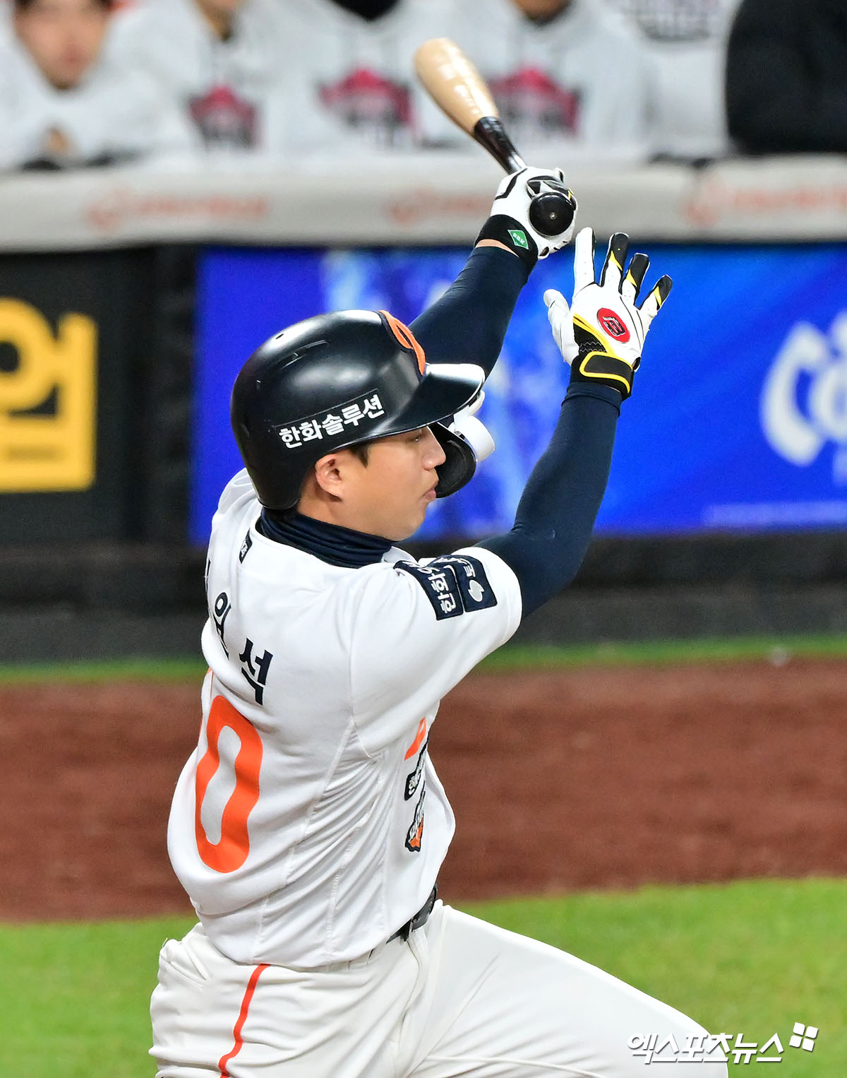 (엑스포츠뉴스 대전, 김한준 기자) 31일 오후 대전 한화생명 볼파크에서 열린 '2025 신한 SOL Bank KBO 한국시리즈' LG 트윈스와 한화 이글스의 5차전 경기, 2회말 1사 만루 한화 이원석이 3루 주자를 불러들이는 타격을 하고 있다.