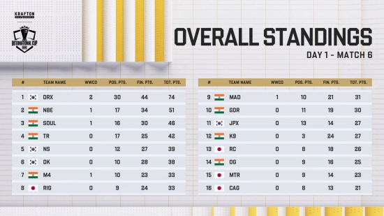 1일 차 경기 결과, DRX가 하루에만 2치킨을 뜯으며 74점으로 1위에 올랐다. 그리고 뒤를 이어 NBE가 51점으로 2위, SOUL이 46점으로 3위, TR이 42점으로 4위, NS가 39점으로 5위, DK가 38점으로 6위에 이름을 올렸다.