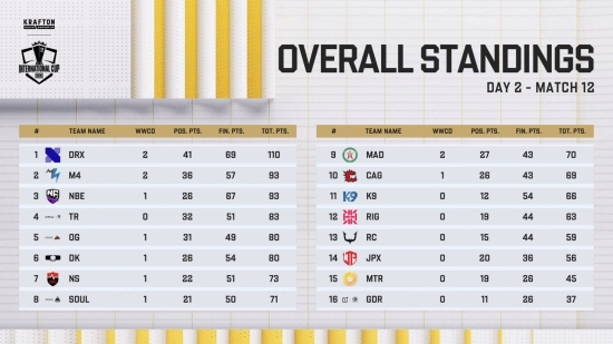 2일 차 경기 결과, DRX가 110점으로 1위에 올랐다. 그리고 뒤를 이어 M4가 93점(2치킨)으로 2위, NBE가 93점(1치킨)으로 3위, TR이 83점으로 4위, OG가 80점으로 5위에 이름을 올렸다.