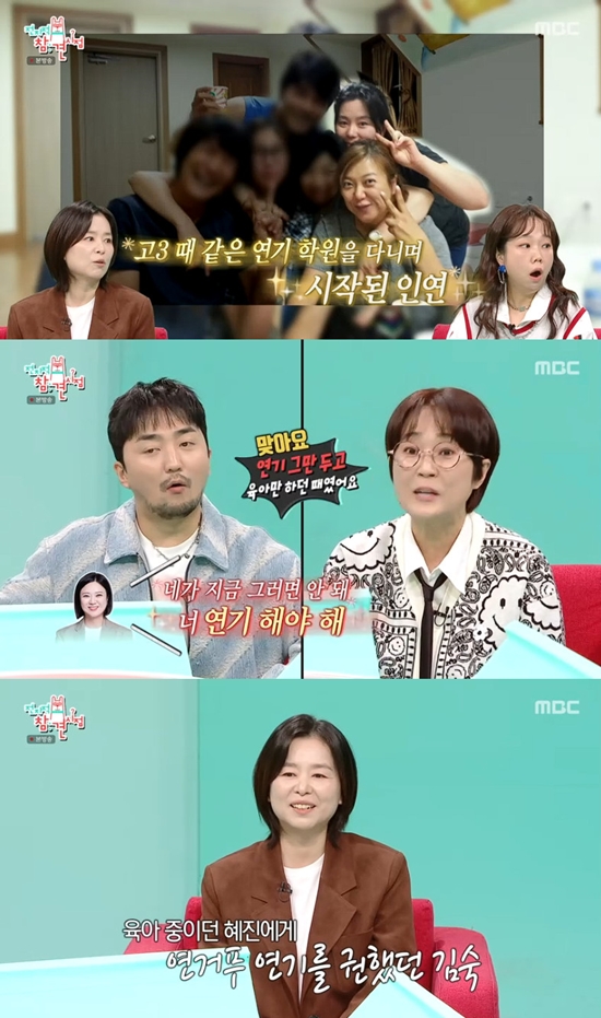 이에 장혜진은 "고3 때 같이 연기 학원을 다녔다. 저는 한예종을 들어가고, 숙이는 부산에 있었다. 숙이가 서울에 와서 연락이 됐는데, '너 뭐 하냐'고 하더라. '애 재우고 있다'고 하니까 '네가 지금 그러면 안 돼. 연기해야 돼'라고 했다"며 당시를 회상했다.
