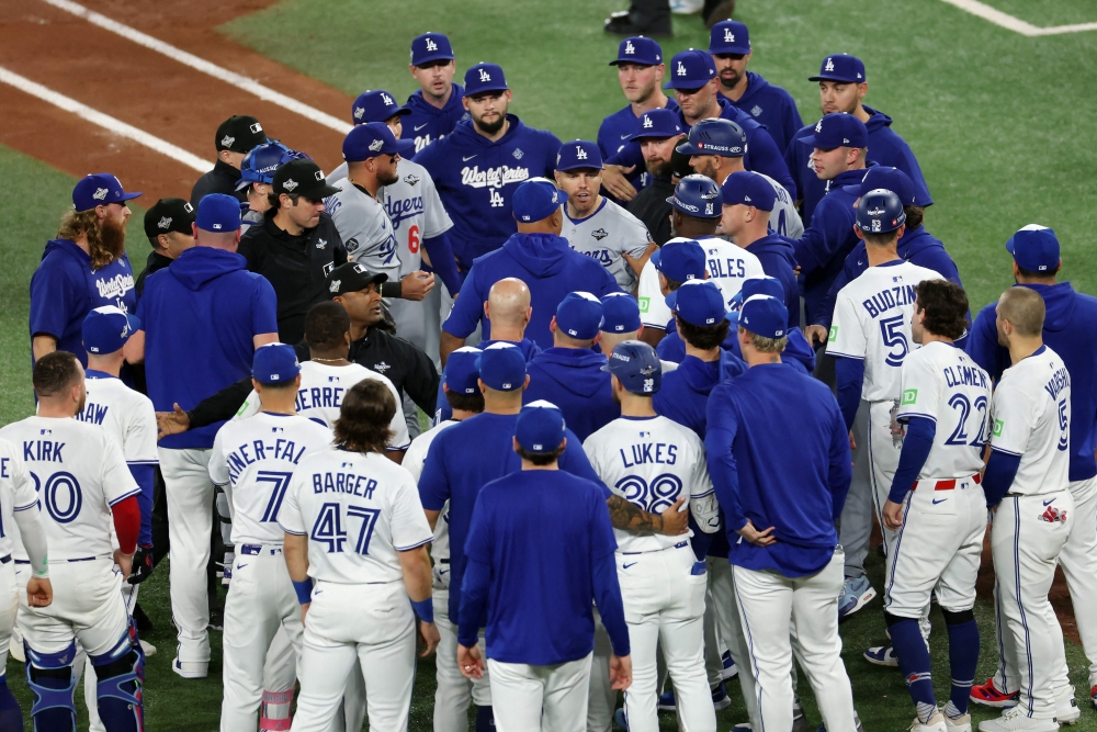 2일(한국시간) 캐나다 온타리오주 토론토의 로저스센터에서 2025 미국 메이저리그(MLB) 포스트시즌 월드시리즈(WS) 7차전 LA 다저스와 토론토 블루제이스의 경기, 4회말 1사 토론토 안드레스 히메네즈의 몸에 맞는 볼 이후 벤치클리어링이 발생했다. AFP 연합뉴스