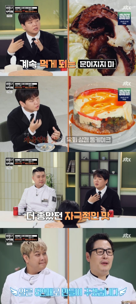 윤남노 셰프는 '문어지지 마'를, 김풍 작가는 '육회 상쾌 통케이크'를 선보였다. 곽튜브는 불쇼로 시작한 '문어지지 마' 조리 과정에 크게 놀라워하며 기대를 드러냈다.