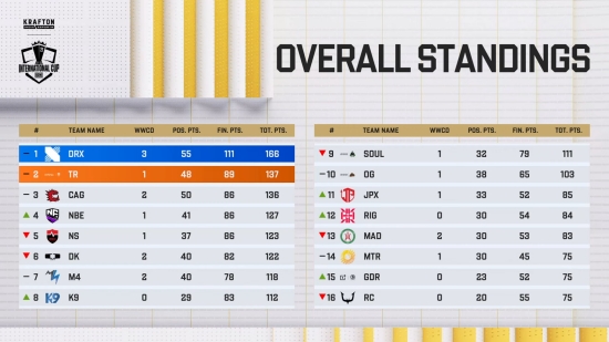 3일 차 경기 결과, DRX가 166점으로 1위에 올랐다. 그리고 뒤를 이어 TR이 137점으로 2위, CAG가 136점으로 3위, NBE가 127점으로 4위, NS가 123점으로 5위에 이름을 올렸다.